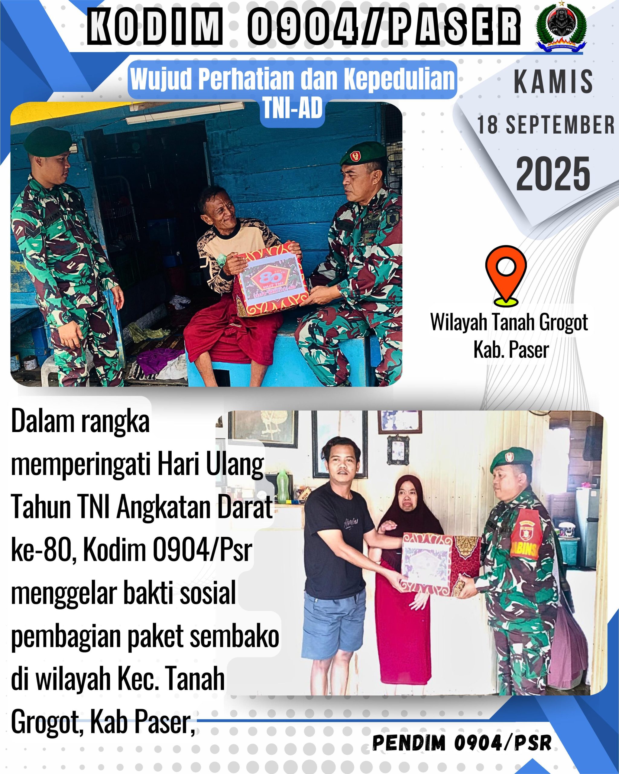 Kodim 0904/Psr, Korem 091/ASN, Kodam VI/Mlw – Dalam rangka memperingati Hari Ulang Tahun TNI Angkatan Darat ke-80, Kodim 0904/Psr menggelar bakti sosial pembagian paket sembako di wilayah Kec. Tanah Grogot, Kab Paser, Rabu (18/9/2025).