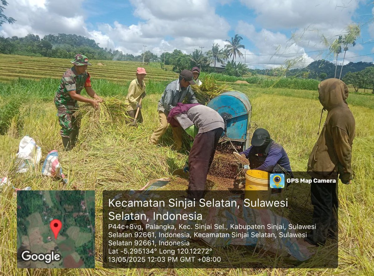 Sinjai – Babinsa Desa Palangka Koramil 1424-05/Sinjai Selatan, Serda Asri Majid, menunjukkan komitmennya dalam mendukung ketahanan pangan melalui kegiatan pemantauan dan pendampingan panen padi di wilayah binaannya. Kegiatan ini dilaksanakan di lahan seluas 0,50 hektar milik Bapak Bahri, anggota Kelompok Tani Buhung Lembang Keke, yang berlokasi di Dusun Honto, Desa Palangka, Kecamatan Sinjai Selatan, Kabupaten Sinjai, Selasa (13/05/2025)