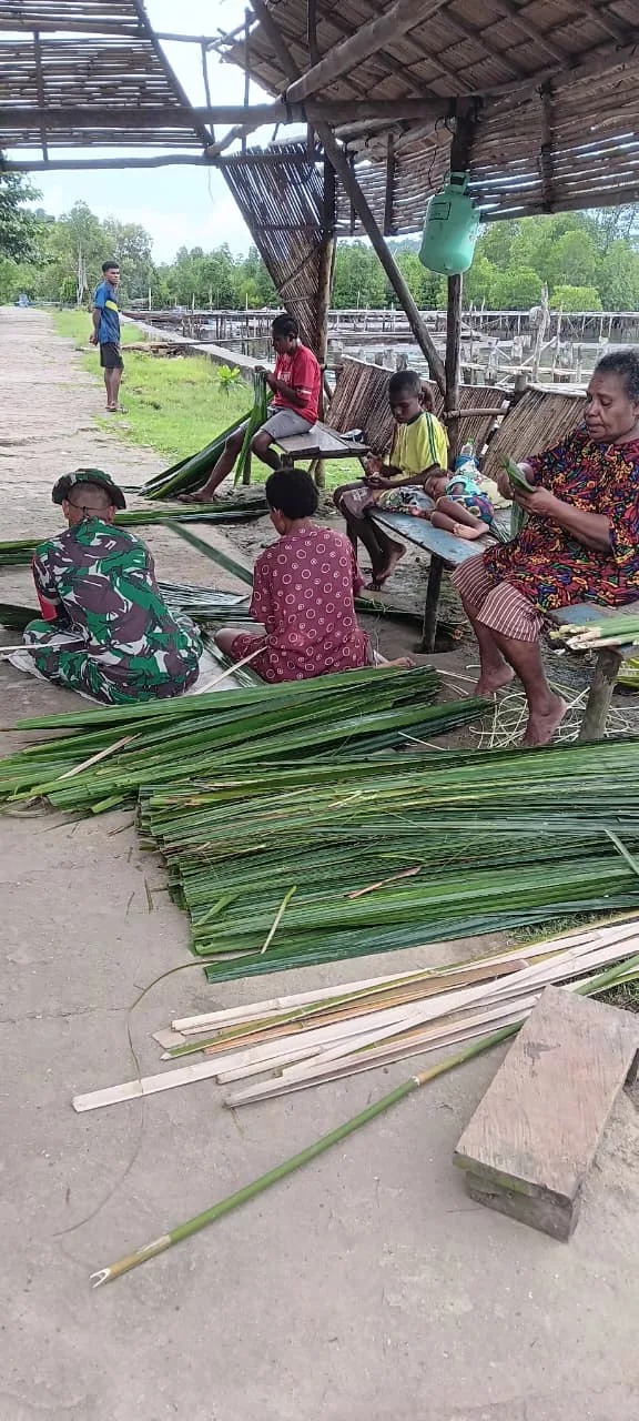 Raja Ampat,PBD– Babinsa Posramil 1805- 04/Misiol, Serda Syarudhin Nussy melaksanakan anjangsana dan sekalian komunikasi sosial (komsos) bersama warga binaannya saat sedang menganyam atap dari daun sagu, di Kampung, Lilinta Distrik Missol kab.Raja Ampat, ,Selasa (30/09/2025).