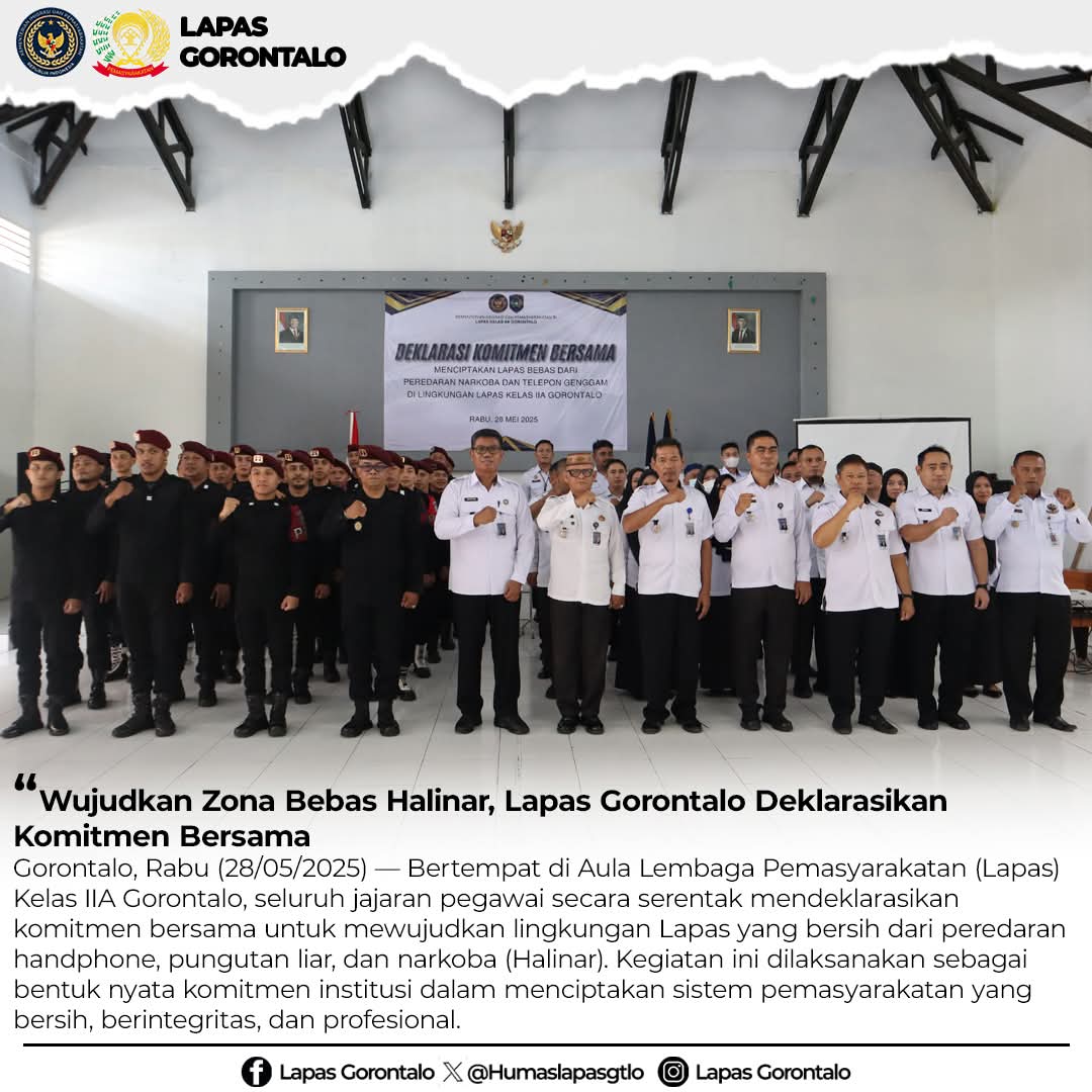 Gorontalo, Rabu (28/05/2025) — Bertempat di Aula Lembaga Pemasyarakatan (Lapas) Kelas IIA Gorontalo, seluruh jajaran pegawai secara serentak mendeklarasikan komitmen bersama untuk mewujudkan lingkungan Lapas yang bersih dari peredaran handphone, pungutan liar, dan narkoba (Halinar). Kegiatan ini dilaksanakan sebagai bentuk nyata komitmen institusi dalam menciptakan sistem pemasyarakatan yang bersih, berintegritas, dan profesional.